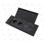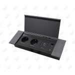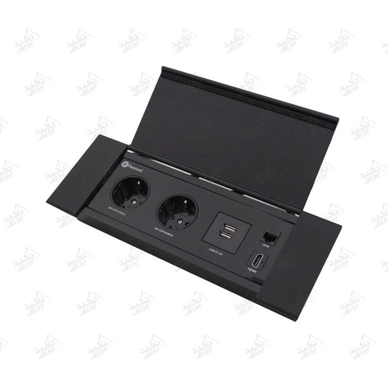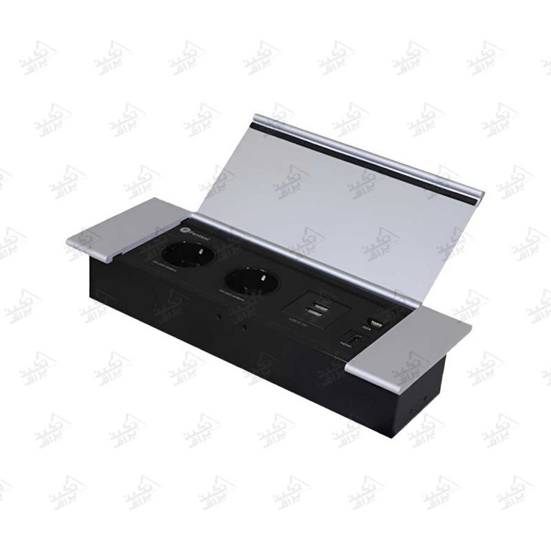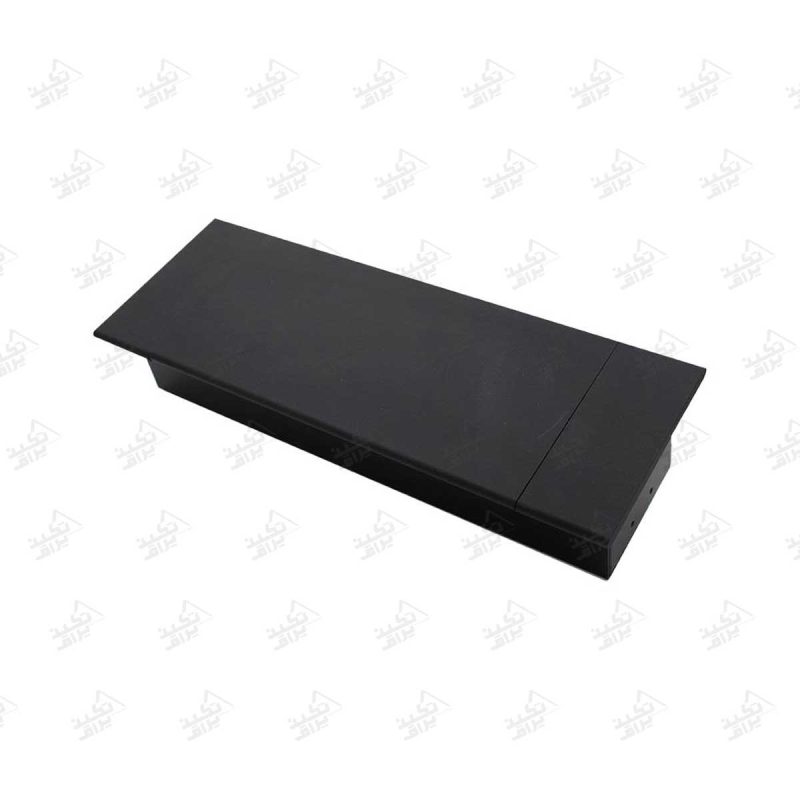 درب این پریز به صورت لولایی طراحی شده است و پس از بسته شدن، کاملاً با سطح میز یا کابینت همسطح میشود. جنس درب از آلومینیوم با پوشش الکترواستاتیک است که در برابر خط و خش، سایش و تغییر رنگ مقاومت بالایی دارد. بدنه اصلی پریز درپوش توکار نیز از ورق فولاد مشکی ساخته شده که استحکام فوقالعادهای به آن میبخشد.