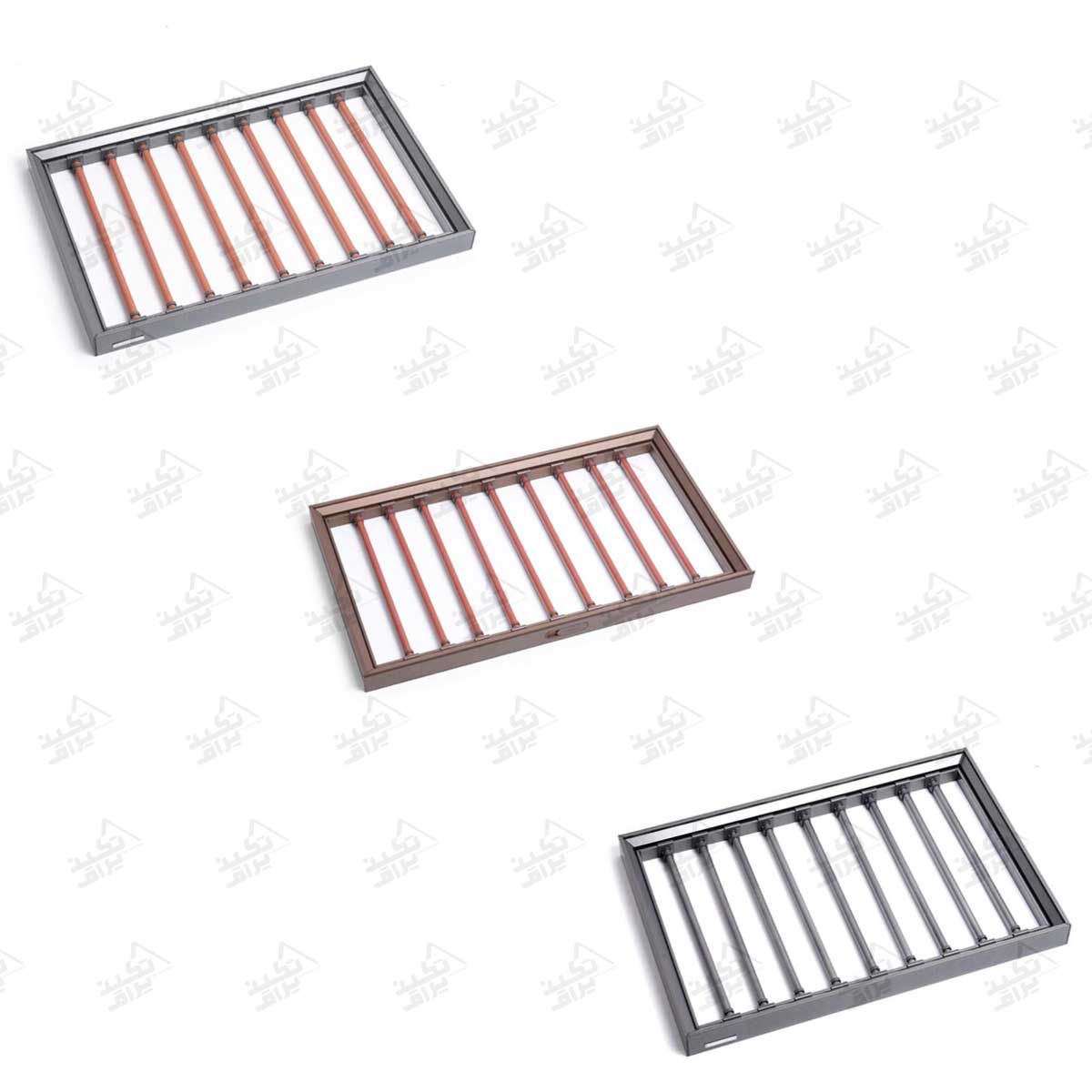 بدنه اصلی از آلومینیوم مقاوم با پوشش الکترواستاتیک ساخته شده و میلههای آویز آن با روکش چرمی طراحی شدهاند. این ترکیب علاوه بر ظاهر لوکس و مدرن، مقاومت بالایی در برابر زنگزدگی، سایش و تغییر رنگ دارد.