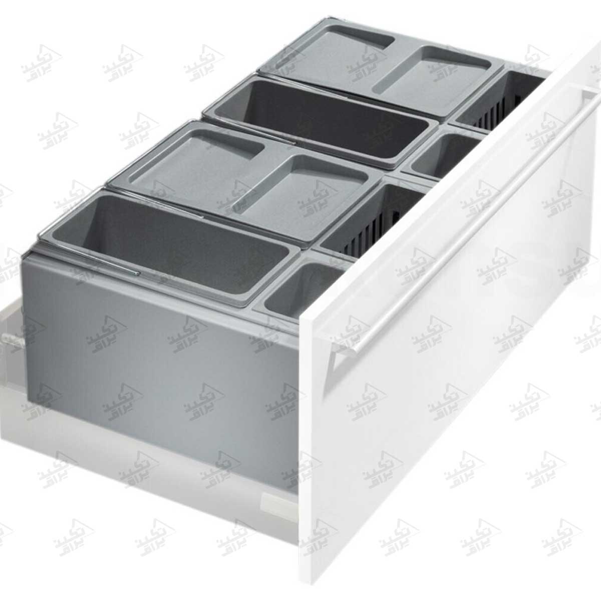 این مخزن سطل زباله پلاستیکی بدون ریل طراحی شده و داخل کشو قرار میگیرد. سطلها روی یک محفظه نگهدارنده اختصاصی قرار میگیرند تا در زمان باز و بسته شدن کشو، هیچگونه لغزش یا حرکتی نداشته باشند. این طراحی باعث افزایش طول عمر کشو و کاربری راحتتر در آشپزخانه میشود.