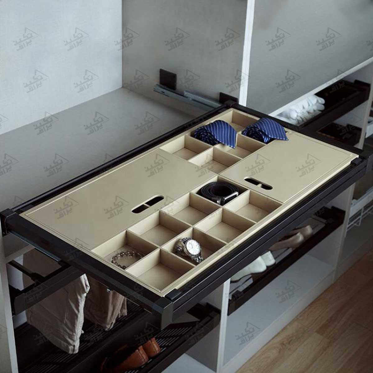 بدنه این نظم دهنده زیورآلات از آلومینیوم مقاوم ساخته شده و با پوشش الکترواستاتیک رنگآمیزی شده است که دوام و مقاومت بالایی در برابر خطوخش، رطوبت و خوردگی دارد. رنگ بدنه موکا، ظاهری مدرن و لوکس به محصول بخشیده و به راحتی با دیگر تجهیزات کمد هماهنگ میشود. فضای داخلی کشو نیز با روکش PVC پوشانده شده تا علاوه بر محافظت از زیورآلات و اکسسوریها، امکان تمیز کردن آسانتری فراهم شود.